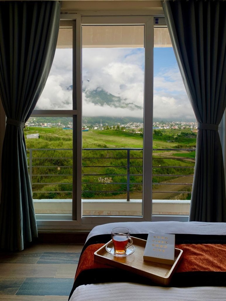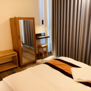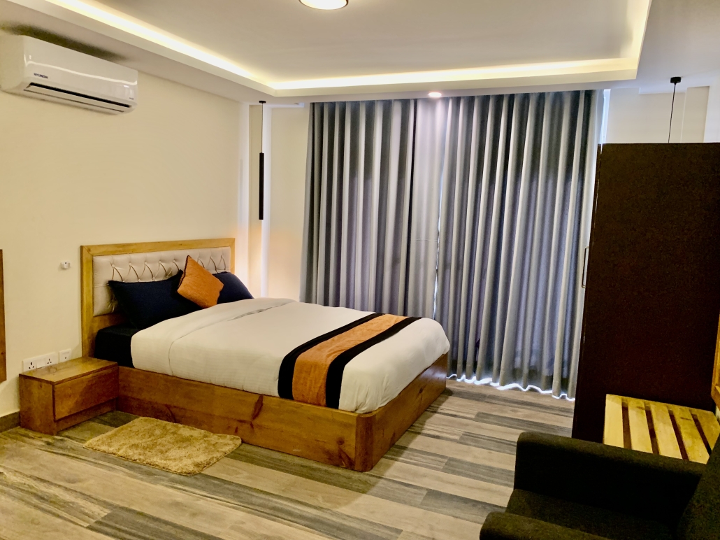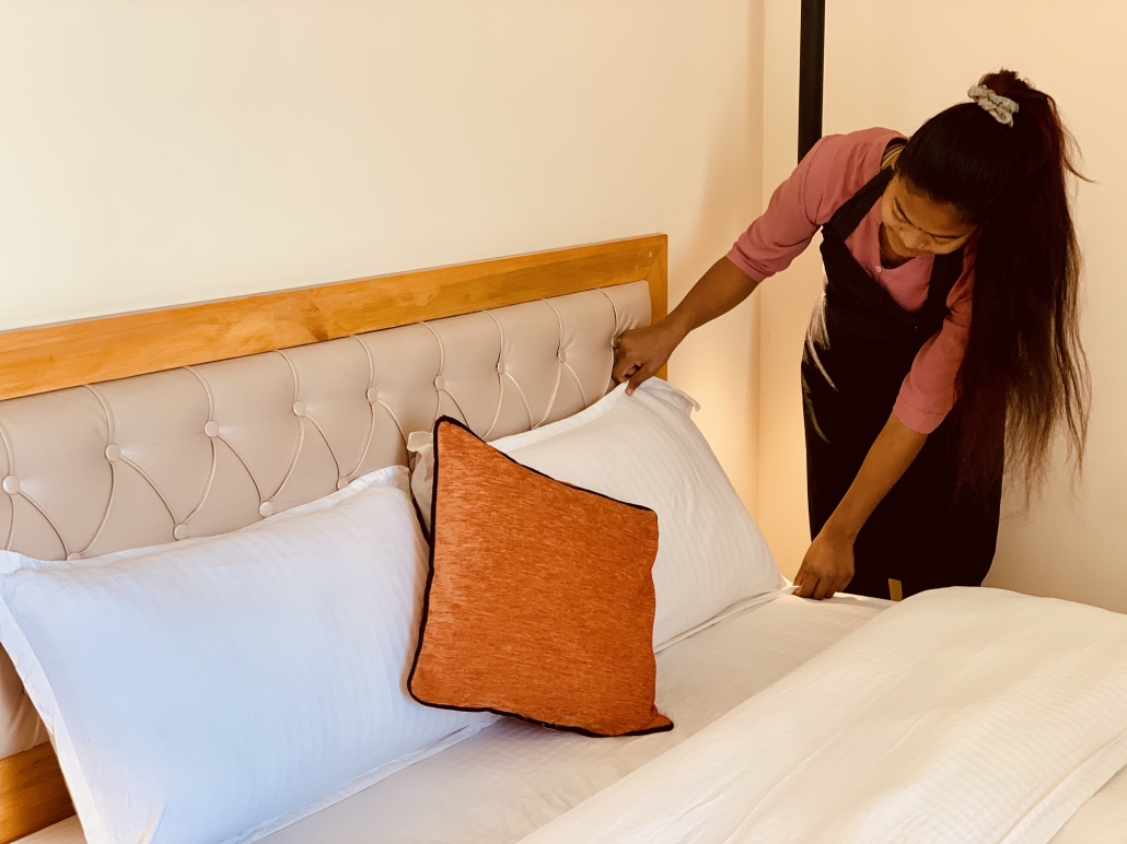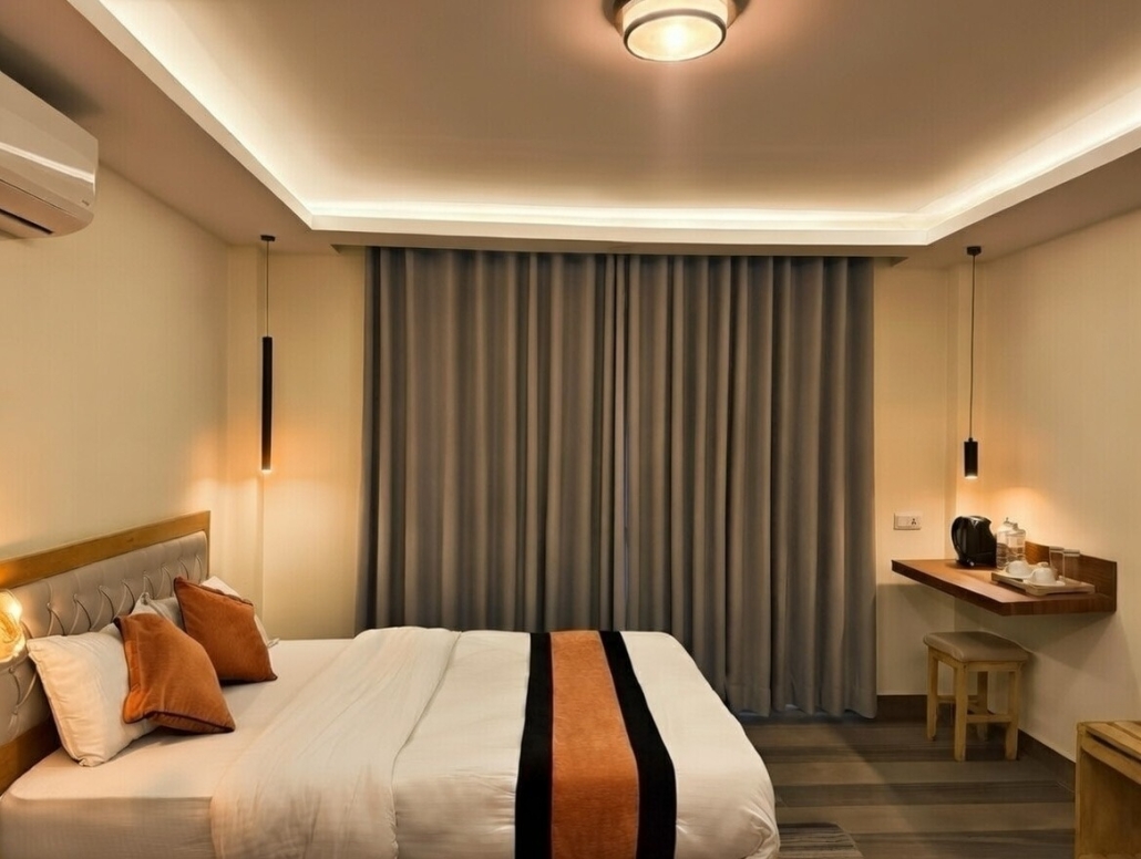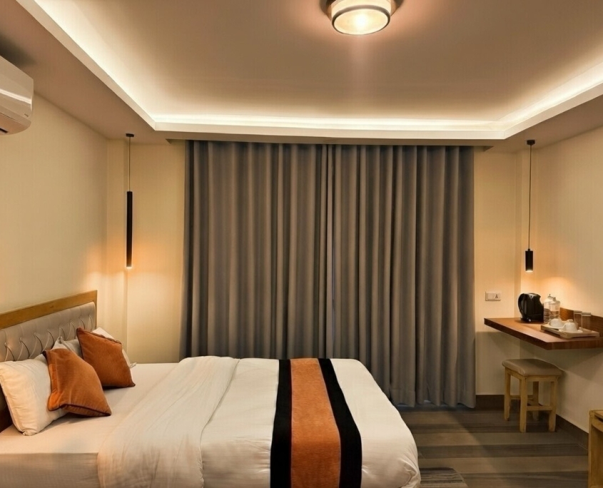 Perfect for: Couples or solo travelers who love extra space. Enjoy a peaceful stay in our air-conditioned Queen room. It features a large, comfortable queen-size bed (5′ x 6.5′) and your own private balcony—perfect for a breath of fresh air. Whether you’re here to work or relax, this room has everything you need.