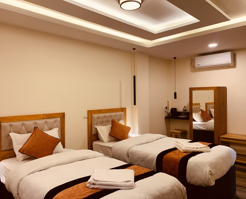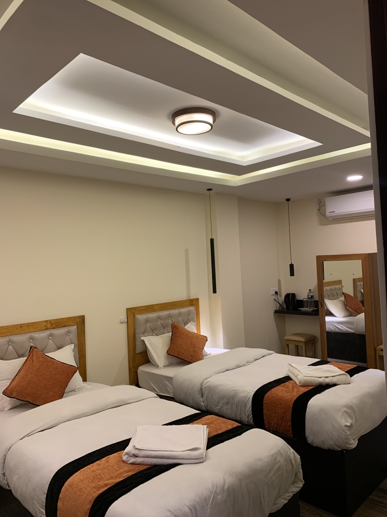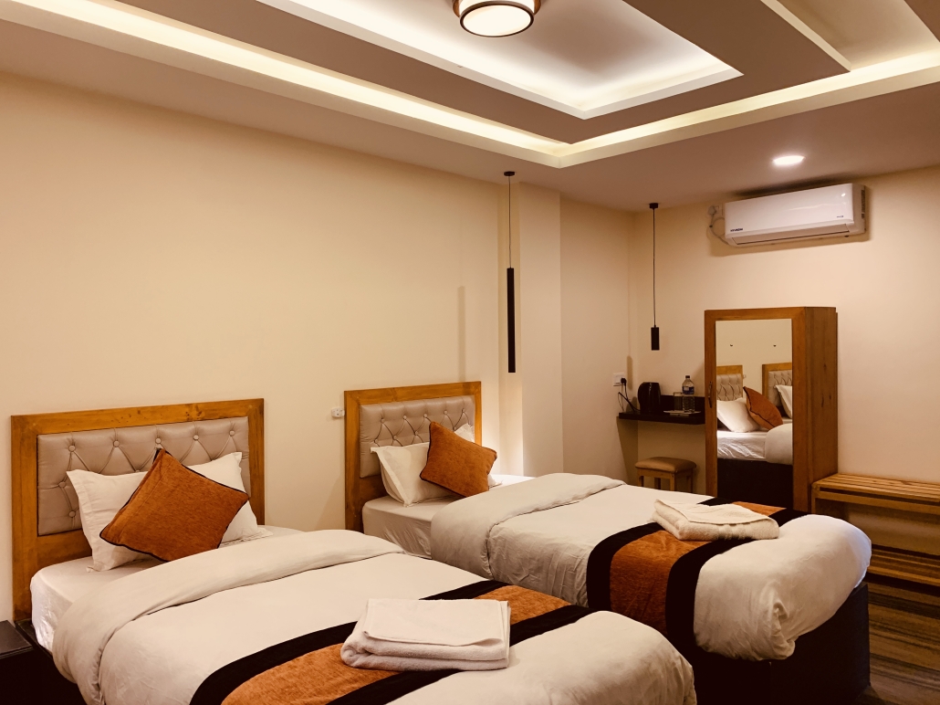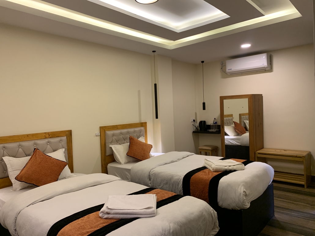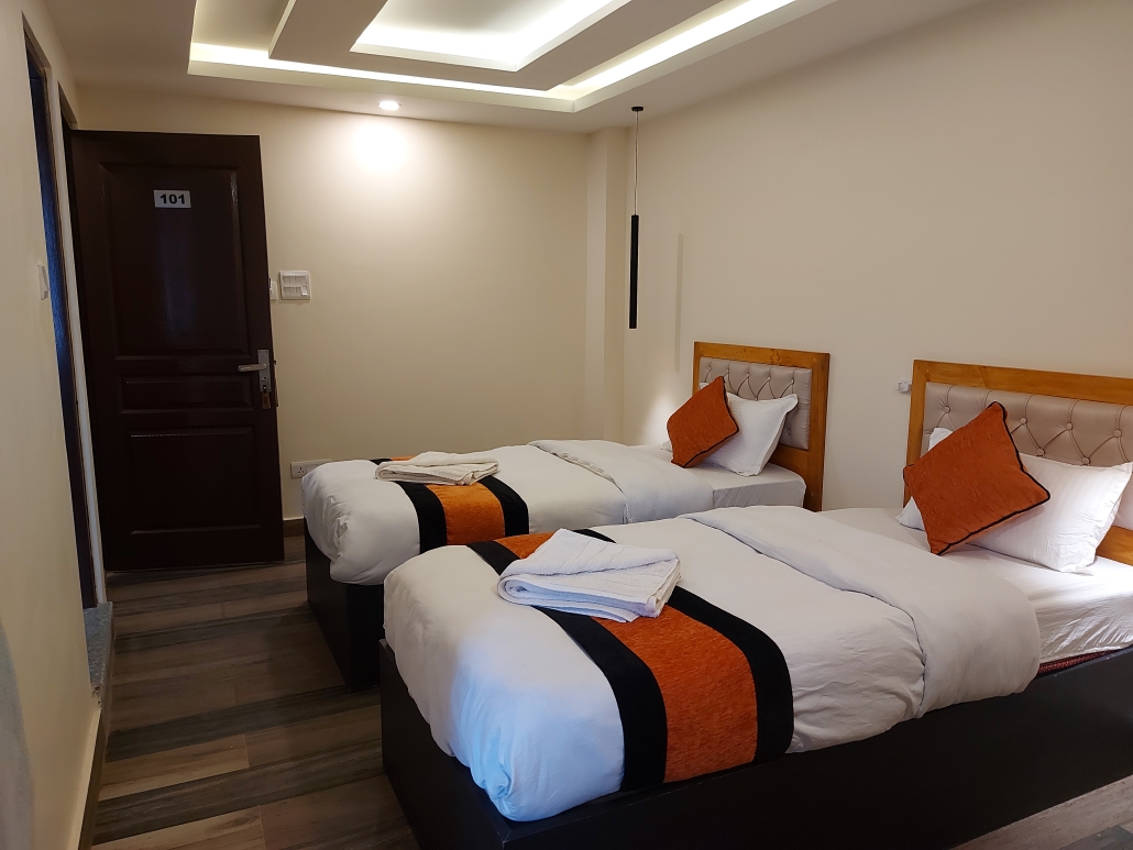 Perfect for: Friends or colleagues traveling together. If you’re traveling with a companion but want your own space, this is the room for you. It features two separate single beds (3′ x 6.5′ each) in a cool, air-conditioned setting, plus a private balcony to enjoy the view.